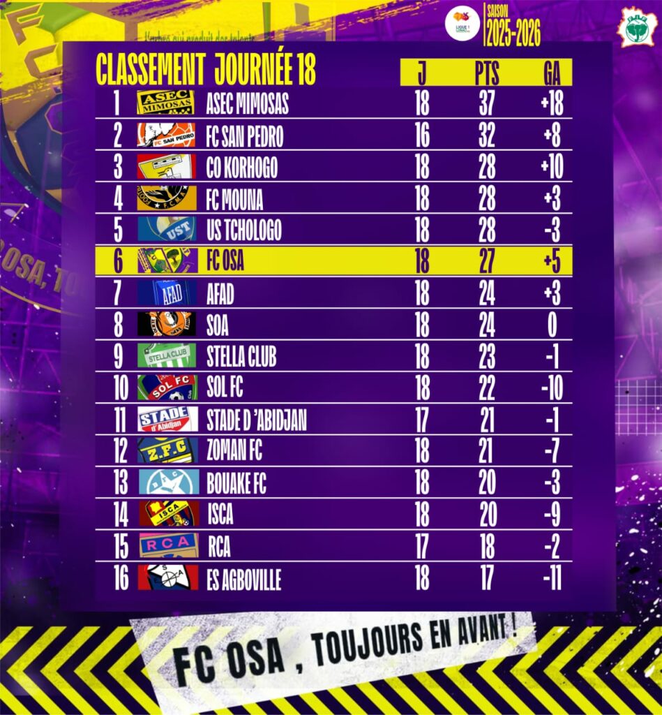 À l’issue de la 18ᵉ journée de la Ligue 1 LONACI saison 2025-2026, le FC OSA confirme sa régularité et occupe la 6ᵉ place du classement avec 27 points et une différence de buts positive de +5.